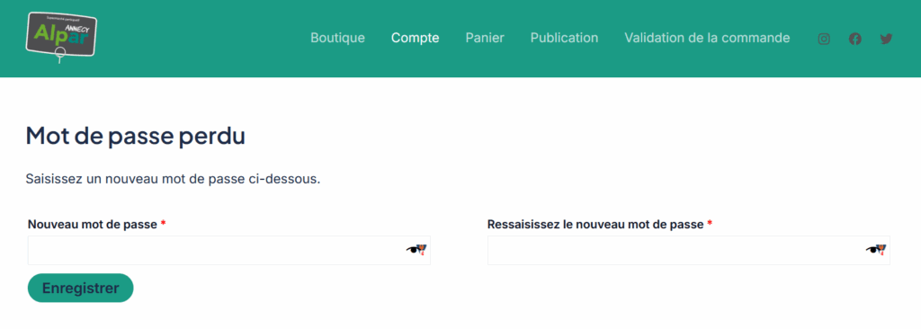 En cliquant sur le lien « Réinitialiser votre mot de passe », une page de réinitialisation est proposée. Il suffit alors de saisir 2 fois le nouveau mot de passe et Enregistrer.